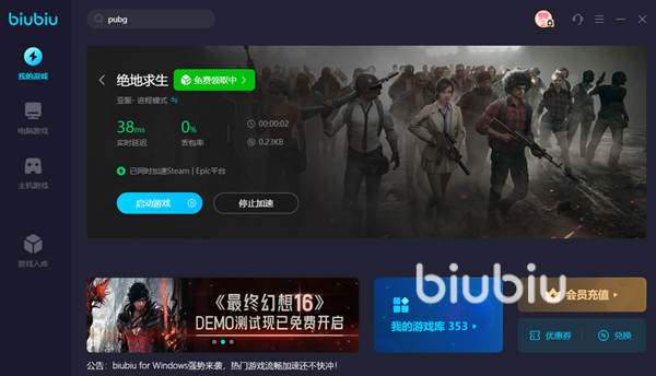 在biubiu加速器內(nèi)搜索這款游戲的名稱,我們可以看到有不同版本能選擇。新用戶下載biubiu加速器可以直接領(lǐng)取24小時免費(fèi)加速的會員特權(quán),這樣我們就能夠在這段時間內(nèi)享受steam版吃雞的流暢體驗了。如果你是主機(jī)版游戲的玩家,那可真的是有福了,biubiu針對大部分的主機(jī)游戲都提供了免費(fèi)的加速福利,這樣搭配著來使用還是非常合適的,不需要去額外購置別的加速產(chǎn)品。