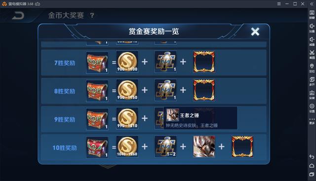 只需在懸賞金賽里做完十勝,就能得到專(zhuān)門(mén)的鐘無(wú)艷皮膚王者之錘。用雷電模擬器,最好適配又有英雄專(zhuān)門(mén)鍵位,拿個(gè)十勝一點(diǎn)都不是問(wèn)題!