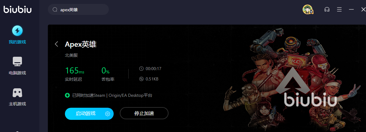 Biubiu加速器許多人可能之前都有用過,這些年來它經(jīng)過不斷升級和完善,將自己的節(jié)點服務(wù)器強化的非常優(yōu)秀,在游戲庫里輸入“apex”就能找到switc端和pc端兩款游戲,玩家對應(yīng)選擇后就能去進行加速,這段時間biubiu加速器還開放了新用戶24小時的免費使用,要是感覺確實好用的話再去考慮開通會員來使用,綜合性價比很高,主要是加速效果強勁,降低延遲效果很明顯。