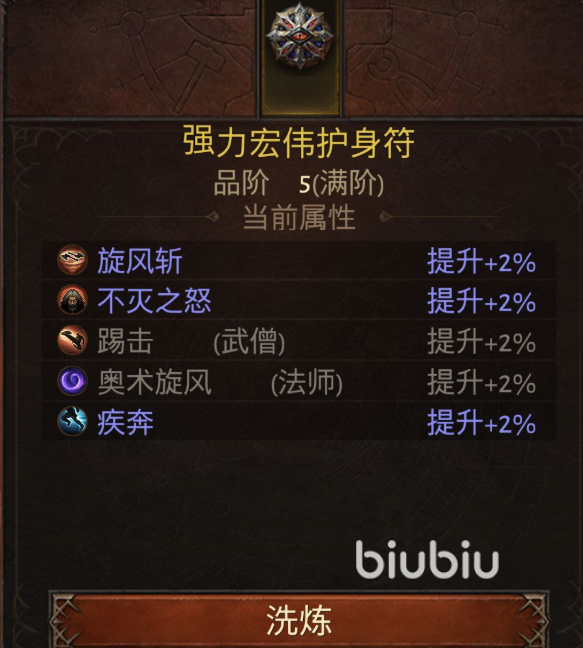 分解一個(gè)護(hù)身符,可以得到10個(gè)升階材料,1-4階的護(hù)身符,都是可以通過消耗20個(gè)升階材料進(jìn)行升階的,每次升階都可以給護(hù)身符附加一個(gè)技能,但是呢這個(gè)技能是全職業(yè)隨機(jī)的,并且只能+2%,5階的護(hù)身符,基礎(chǔ)技能是旋風(fēng)斬+2%,升級(jí)到5階,多了4個(gè)技能,因?yàn)橐还灿?個(gè)職業(yè)嘛,所以升階獲得本職業(yè)技能的概率是1/6,運(yùn)氣還是比較好,隨機(jī)到了不滅之怒和疾奔兩個(gè)本職業(yè)技能,另外兩個(gè)技能都是其他職業(yè)的。