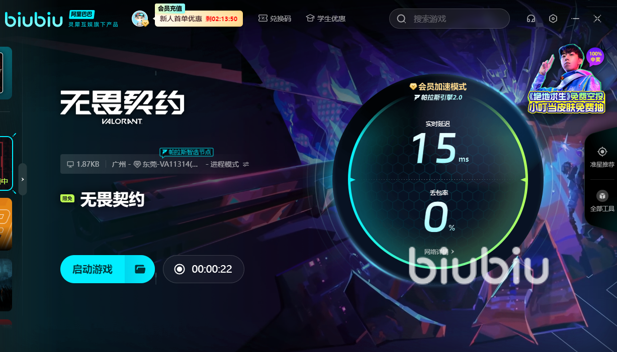 想要真正的開展無畏契約比賽,就得避免卡住,不然中途也會消亡。使用biubiu之后,當(dāng)然讓比賽變得勢均力敵,而不是率先落入下風(fēng)。新用戶的話可領(lǐng)取24小時的免費加速,另外新老用戶輸入【biubiu不卡頓】,便可額外獲得三天免費加速。當(dāng)開啟團戰(zhàn)時延遲太高的話,就不能配合好對方,例如用地雷先掩護好隊友。用上加速器后,才能讓你無縫銜接隊友的技能,而不是只能呆呆的看對方保護你。