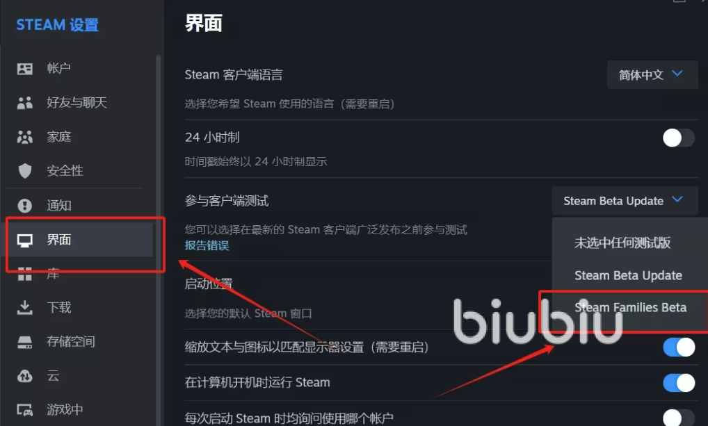 首先我們點擊客戶端左上角的”steam”,找到設(shè)置,選擇界面,在里面找到參與客戶端測試,選項選擇steam families beta,設(shè)置后會自動重啟客戶端。做完以上操作后再進入設(shè)置找到家庭,創(chuàng)建家庭后邀請好友即可完成操作。