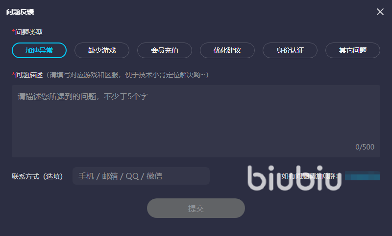 要是說在biubiu加速器使用過程中遇見各種問題,均可尋找客服來進(jìn)行投訴和反饋,選擇好自己的問題和原因提交上去,就有專人后續(xù)會(huì)來幫你進(jìn)行處理,或者說你還有什么建議想要給出的,都能夠在右上角的問題反饋處寫下來,也可選擇性的留下聯(lián)系方式來跟進(jìn)。