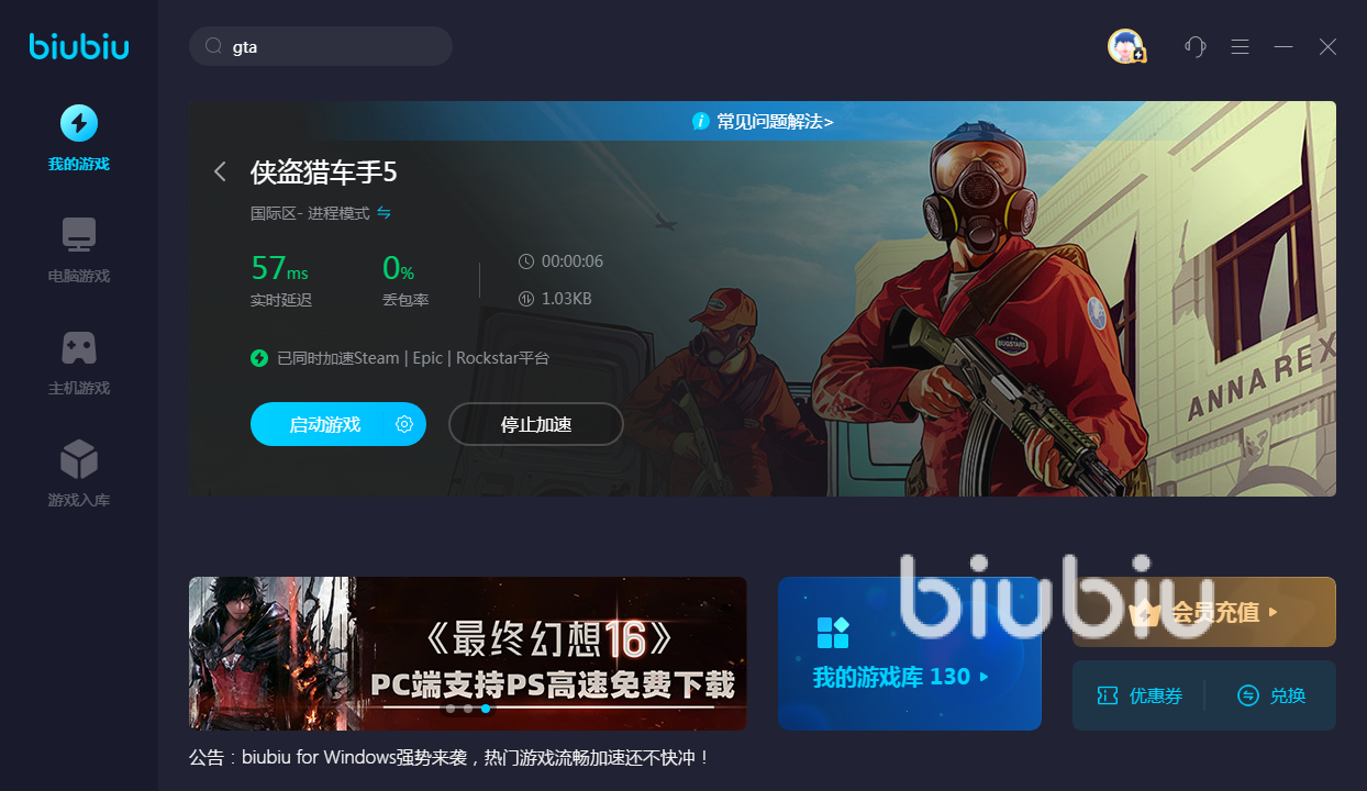 但是在線出現(xiàn)閃退問題始終是大麻煩,非常影響體驗(yàn)感。此時(shí)利用biubiu加速器就能夠非常輕松解決。這是一款操作簡(jiǎn)單功能非常強(qiáng)大的游戲輔助工具,可以應(yīng)用在PC端,主機(jī)端等很多不同平臺(tái),都能達(dá)到優(yōu)質(zhì)網(wǎng)絡(luò)優(yōu)化效果。具體操作方式就是在資源庫中找到游戲,添加到列表中就可以開始加速。并且直接打開客戶端進(jìn)入游戲開始體驗(yàn),所有本地游戲都可以放到這里統(tǒng)一管理。每次加速之后都會(huì)記錄時(shí)間并且進(jìn)行打分,促進(jìn)軟件進(jìn)步。