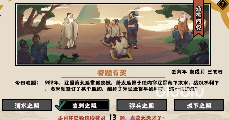這期給出的問(wèn)題是在九八二年的時(shí)候,遼國(guó)是由一位太后掌控了當(dāng)時(shí)的大權(quán),那時(shí)的她還命令自家的軍隊(duì)往南進(jìn)攻,勢(shì)必要將宋國(guó)攻打下來(lái),不過(guò)最終的戰(zhàn)況并不理想,然后就與宋國(guó)簽訂了一個(gè)盟約以此維護(hù)了兩國(guó)的百年和平,請(qǐng)問(wèn)這項(xiàng)盟約是什么。這里正確的答案便是澶淵之盟。