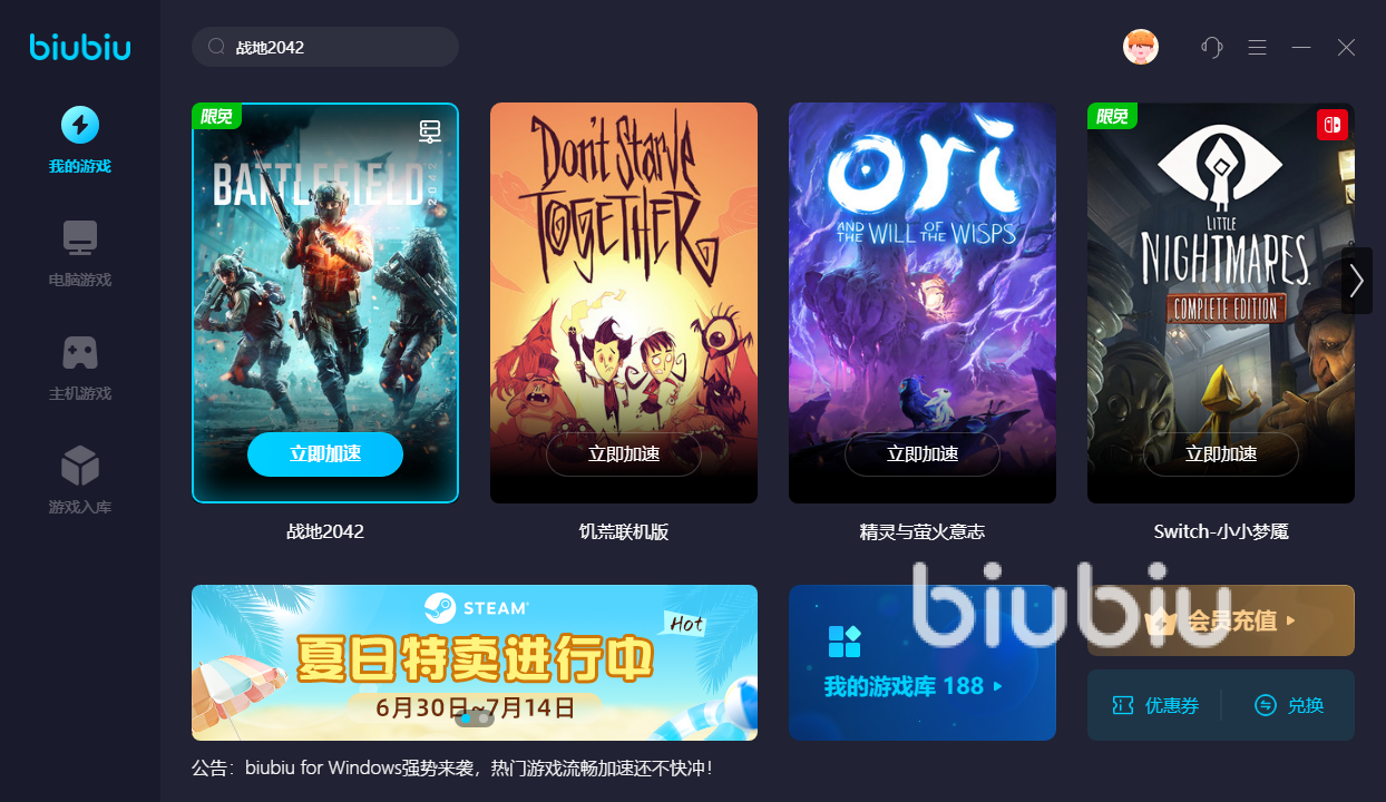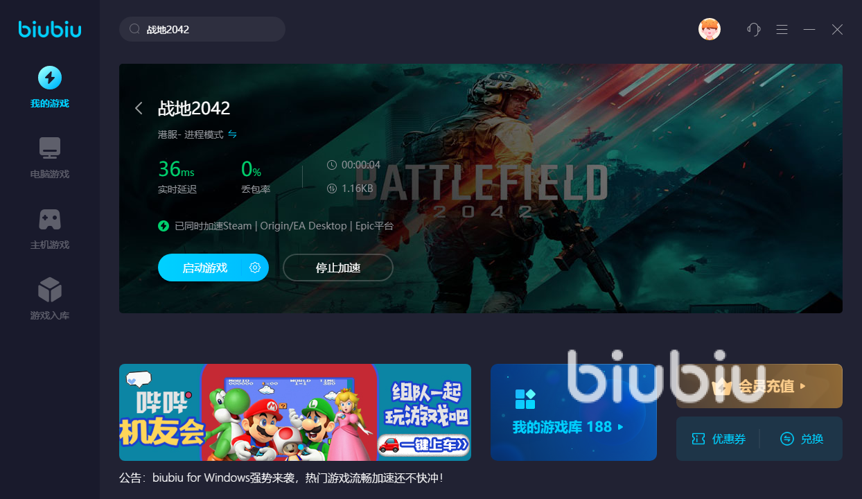 考慮到有很多新人用戶是第一次去使用加速類工具,如果界面太過(guò)復(fù)雜的話,肯定是不行的,而biubiu的這款加速工具讓人看起來(lái)就非常的舒服,主要的功能都是在左側(cè)進(jìn)行了展示,玩家可以在游戲庫(kù)里面發(fā)現(xiàn)各類不同的游戲,這個(gè)時(shí)候直接去查找就可以了,然后點(diǎn)擊開(kāi)啟加速,就可享受它帶來(lái)的服務(wù),根本就不需要擔(dān)心會(huì)有掉線的情況發(fā)生。