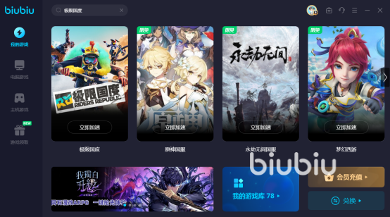 現(xiàn)在很多的游戲玩家都想要體驗一下官方的福利,主要就是新用戶通過注冊登錄以后就可免費享受對游戲加速到24小時,新老用戶還可以使用正確輸入兌換碼【biubiu不卡頓】的方式來領取免費三天的加速時長,這是每個用戶都可領取到的。