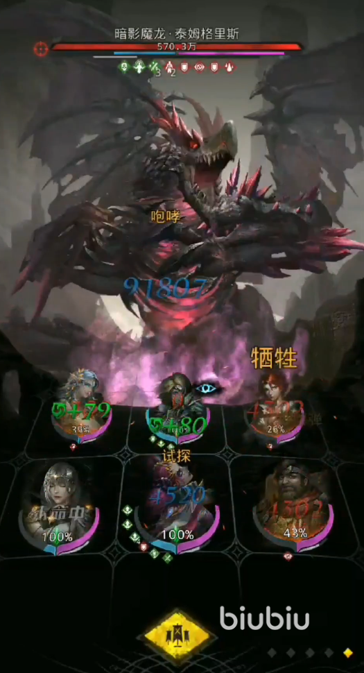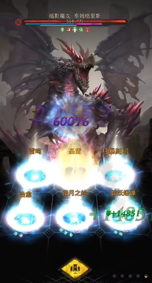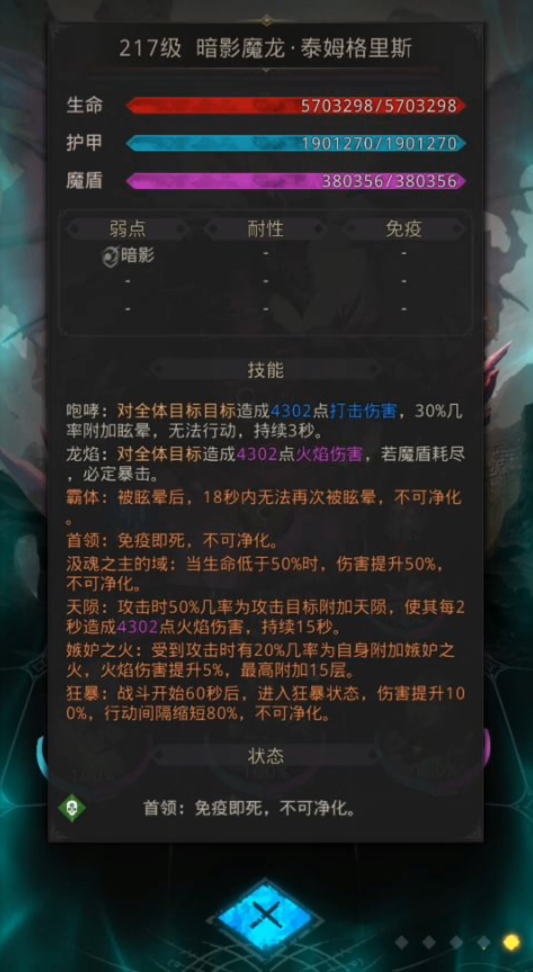 本關卡較為麻煩的就是217的暗影魔龍,五百七萬左右的血量讓很多玩家非常頭痛,而且強大而霸體和全體傷害很容易讓一些低恢復陣容的玩家暴斃!