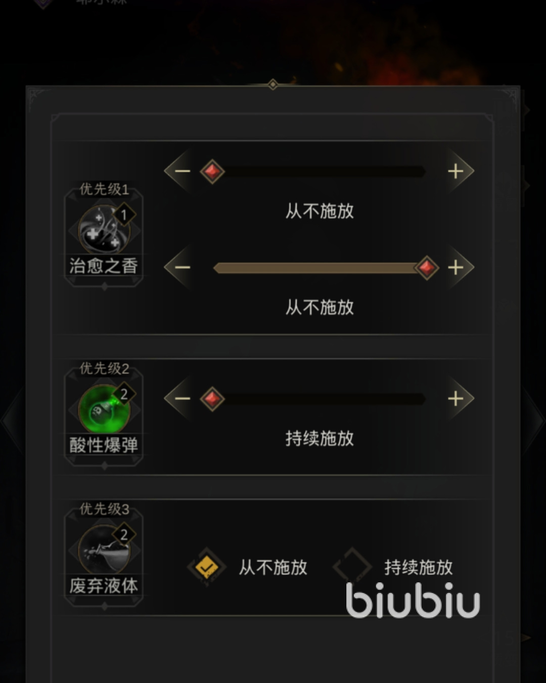 奶需要持續(xù)回血,尤其是和小編這種等級(jí)不高,裝備一般的,持續(xù)回血不要停。在戰(zhàn)術(shù)設(shè)置里,只選擇回血技能,關(guān)掉攻擊技能,并且選擇持續(xù)釋放,不要怕奶吐了。