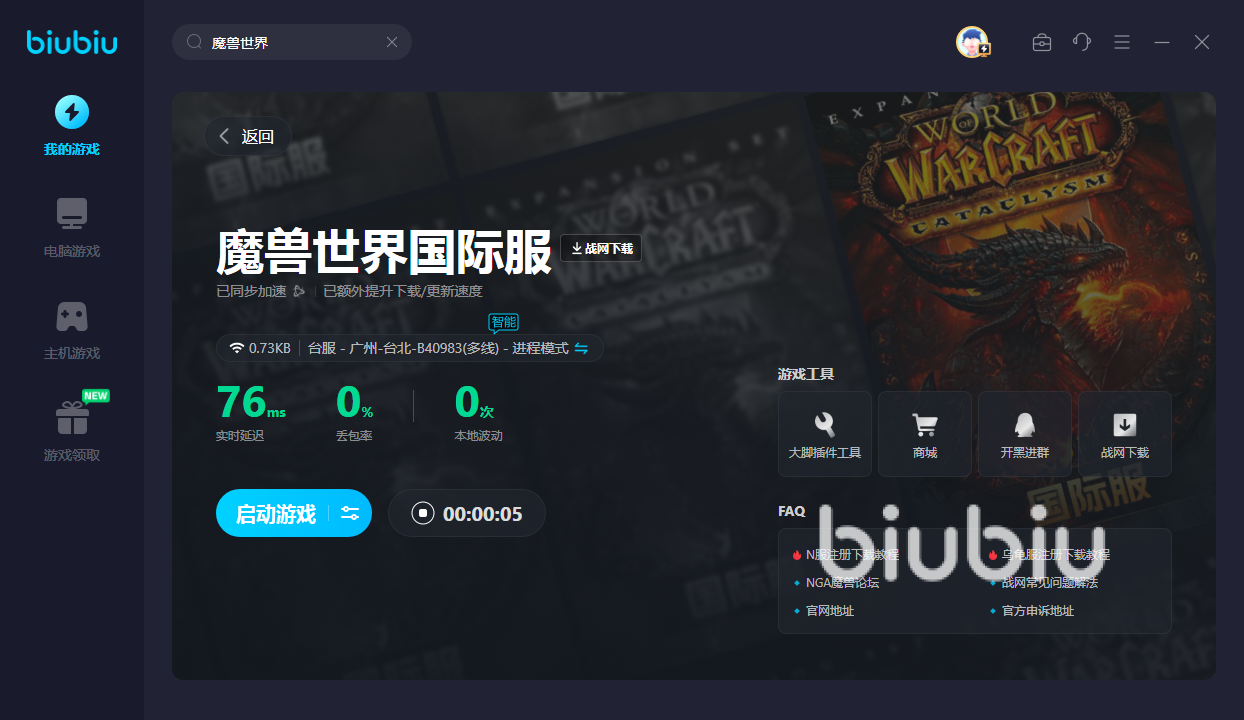 另外biubiu還有一個很好的功能,那就是可以幫助大家輕松登陸外服,眾所周知現(xiàn)在魔獸世界在國服已經停止運行,大家只能去國際服體驗。而有了biubiu的跨服功能之后,就可以任意選擇自己想去的國際服,不需要在自己對各種各樣的網絡進行設置,既輕松又簡單,登錄客戶端就能直接在服務器中進行切換。而且在外服運行的時候也能保持較好的延遲,不會因為延時過高而影響游戲正常體驗。