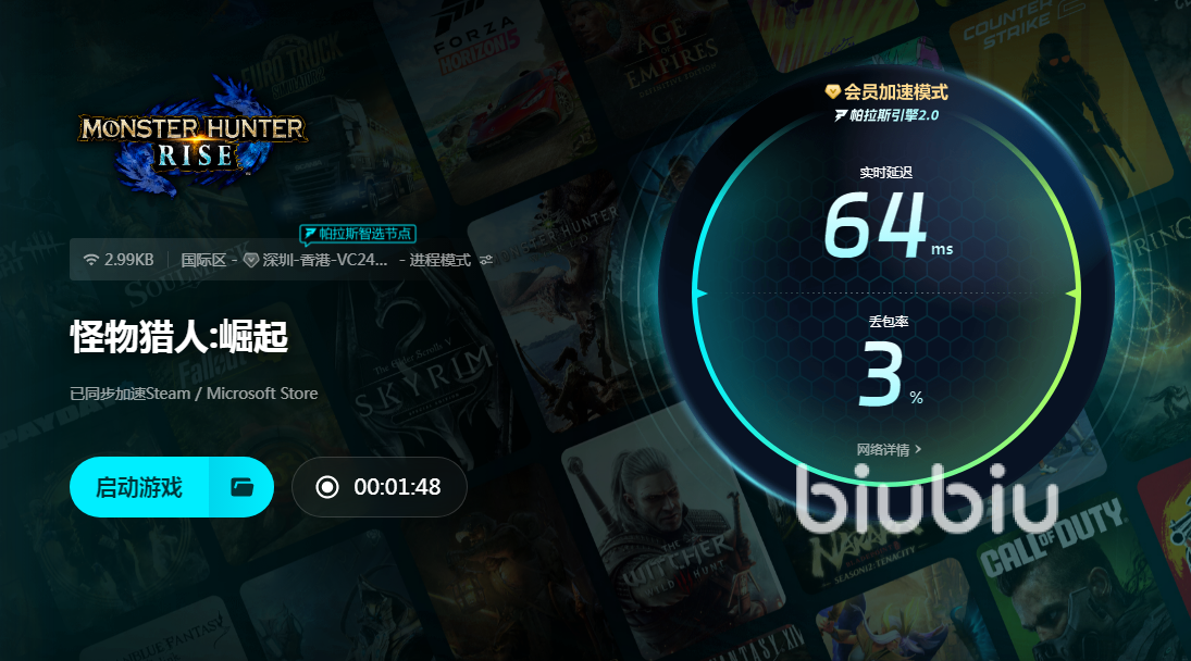 當玩家選擇成為pc端會員之后,還可以享受到直接去加速海量主機游戲的福利。玩家將怪物獵人崛起這個游戲名稱輸入進去后,就可以查看到很多選項,除了一款pc端的選項內容之外,還有很多這款游戲的主機選項。涵蓋的主機平臺包括ps、switch、XBox等,這些都可以通過biubiu連接之后來進行加速,在優(yōu)化后的效果同樣非常出色,可以讓大家獲得更為流暢的游戲內戰(zhàn)斗以及探險體驗。這也就實現(xiàn)了一款賬號在多個平臺使用,所以性價比非常高,價格方面只需要每天不到一元錢,就可以長期使用下去。大家一次性購買的時間越長,價格也就越優(yōu)惠。如果一次性購買一年,那么平均到每月的價格還不到20元錢,這樣的代價相信大家都可以輕松承受。