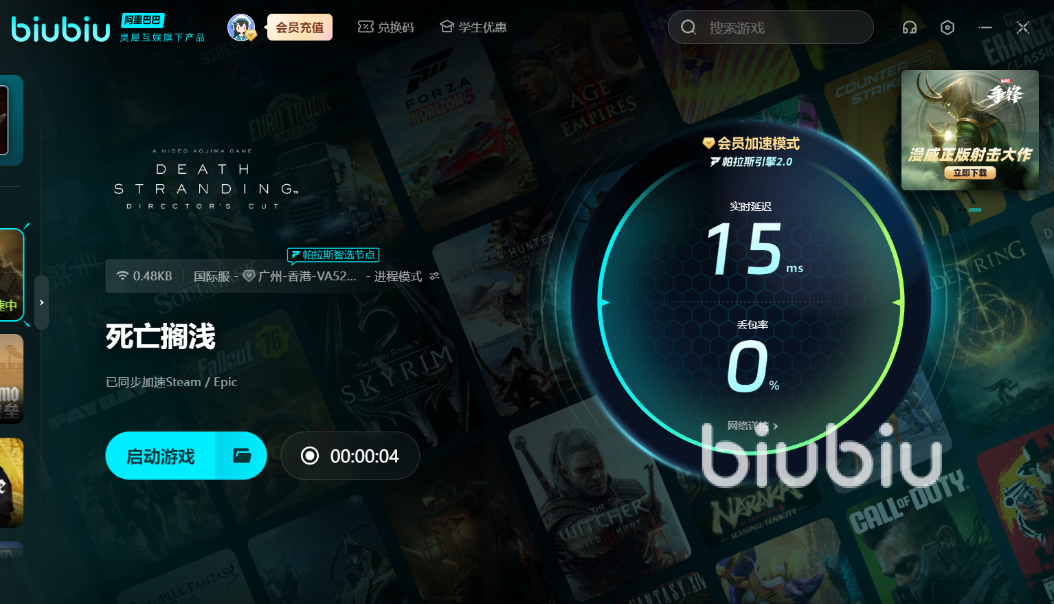 因為這款游戲服務(wù)器節(jié)點都在海外,如果國內(nèi)的玩家直接訪問就特別容易遇到加載慢、轉(zhuǎn)圈失敗等情況,尤其是聯(lián)機玩家來自五湖四海的寬帶環(huán)境復(fù)雜多樣。提前掛上Biubiu軟件,在首頁搜索進入“死亡擱淺”,可直達一鍵加速游戲,點擊開啟就能用。