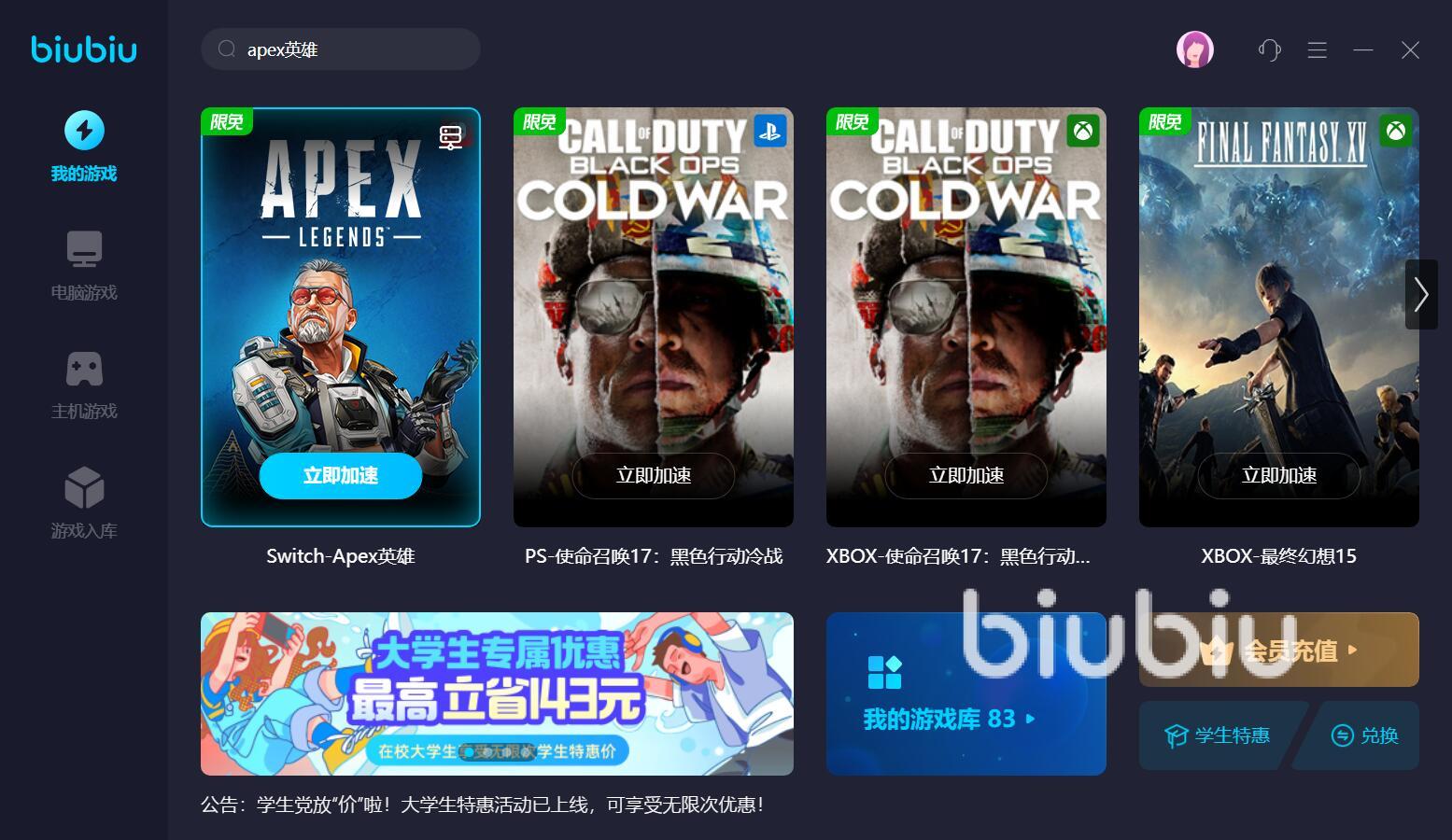 組隊合作是該作品的核心,游戲過程中,想要時刻與隊友的步調(diào)保持一致,并不容易,需要有高速可靠的網(wǎng)絡(luò),才能成功實現(xiàn)。如果你對自己使用的網(wǎng)絡(luò)不放心,可以先用biubiu加速器,去提前進(jìn)行線路優(yōu)化,確保戰(zhàn)斗的時候,不發(fā)生卡頓這類的狀況。而啟動加速也不難,只需找到Apex的加速入口,點(diǎn)擊立即加速選項,即可開啟。對新人用戶,平臺特別贈送了新用戶注冊免費(fèi)使用加速24小時的福利。