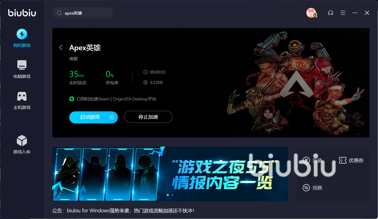 來(lái)源: 極光 作者: Mo 2023年08月14日 17:42很多用戶都來(lái)問小編apex要加速器嗎?對(duì)于融入科幻元素的吃雞類型游戲來(lái)說,最好的建議是需要的,游戲里邊的職業(yè)豐富,同時(shí)吸引了大批量的玩家入坑,國(guó)內(nèi)的網(wǎng)絡(luò)情況小編不多說大家心里也有數(shù)吧,人多的人時(shí)候不搭配加速器真的是帶不動(dòng)啊,這么緊張刺激的挑戰(zhàn)要是突然掉線,砸電腦的心都有了,接下來(lái)給大家說說小編自己用的biubiu加速器好啦。