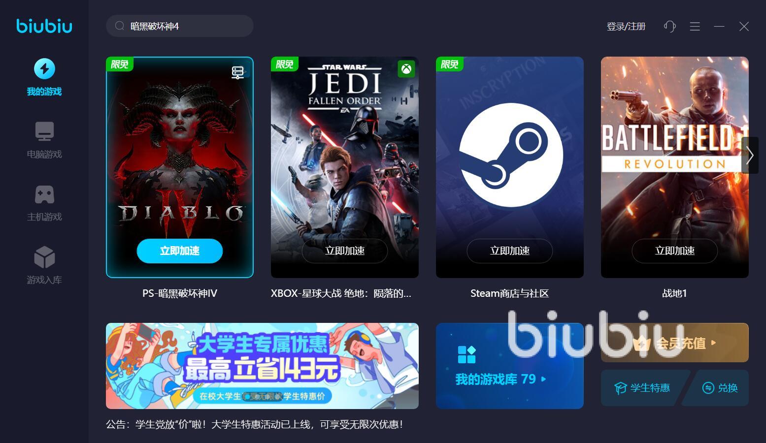 暗黑4中,用戶可探索的地方增多,但與之而來的問題,就是在切換地圖時,畫面會發(fā)現(xiàn)卡頓,導致游戲過程不太順暢,造成這種狀況的原因,很大可能就是網(wǎng)絡不穩(wěn),想要解決,可以去試試biubiu加速器。其中的網(wǎng)絡優(yōu)化服務,可以降低延遲,減少卡頓出現(xiàn)的概率。想要啟動這個功能,只需在軟件內(nèi),搜索到暗黑4專屬的加速入口,接著點擊立即加速即可。如果你是第一次用這個應用,那么還會享受新用戶注冊免費使用加速24小時的福利。