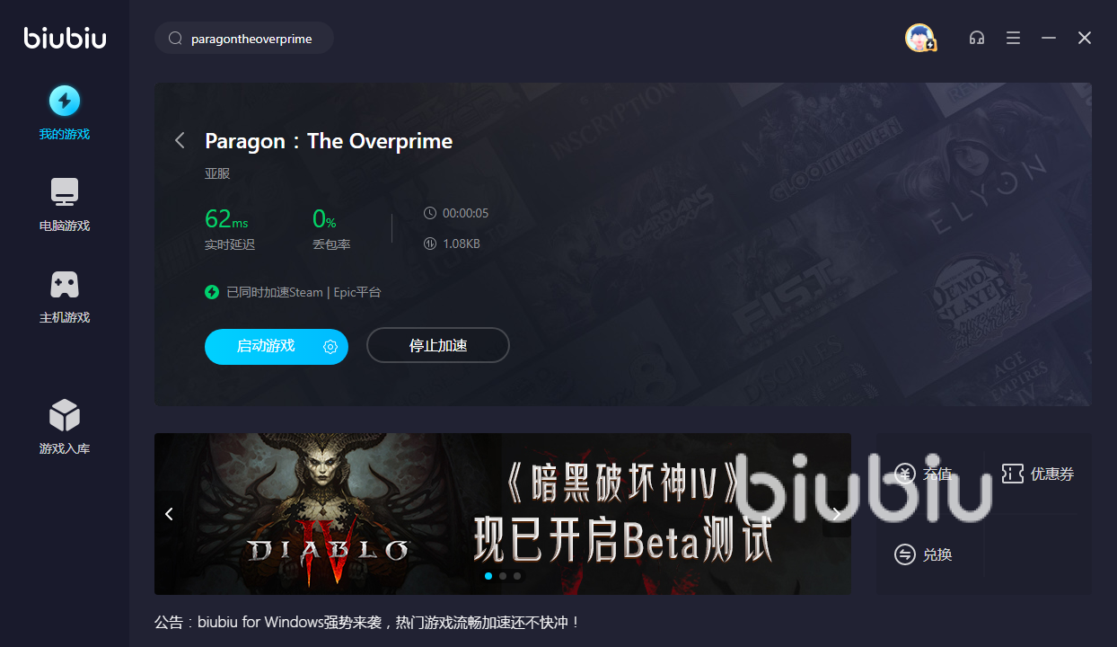 具體戰(zhàn)斗方式很容易上手,沒有太多創(chuàng)新設定。最基礎就是不斷補兵發(fā)育,而后購買裝備推塔擊殺。但游戲本身制作極其細膩,這樣就帶來了巨大硬件壓力,再加上主要以團隊形式進行戰(zhàn)斗,一旦戰(zhàn)場特效全開,在節(jié)奏最緊張時候就容易出現各種卡頓問題。尤其是有一項很大限制,就是目前在國服還沒有專門服務器,國內玩家只能去亞服或是歐服等來進行體驗,這樣就帶來了網絡上的限制,所以小編才推薦大家選擇biubiu加速器來提供幫助,這是一款能夠在端游和手游領域都能提供綜合性服務的加速軟件。需要先下載好加速軟件之后,直接搜索游戲點擊加速的方式進入其中。