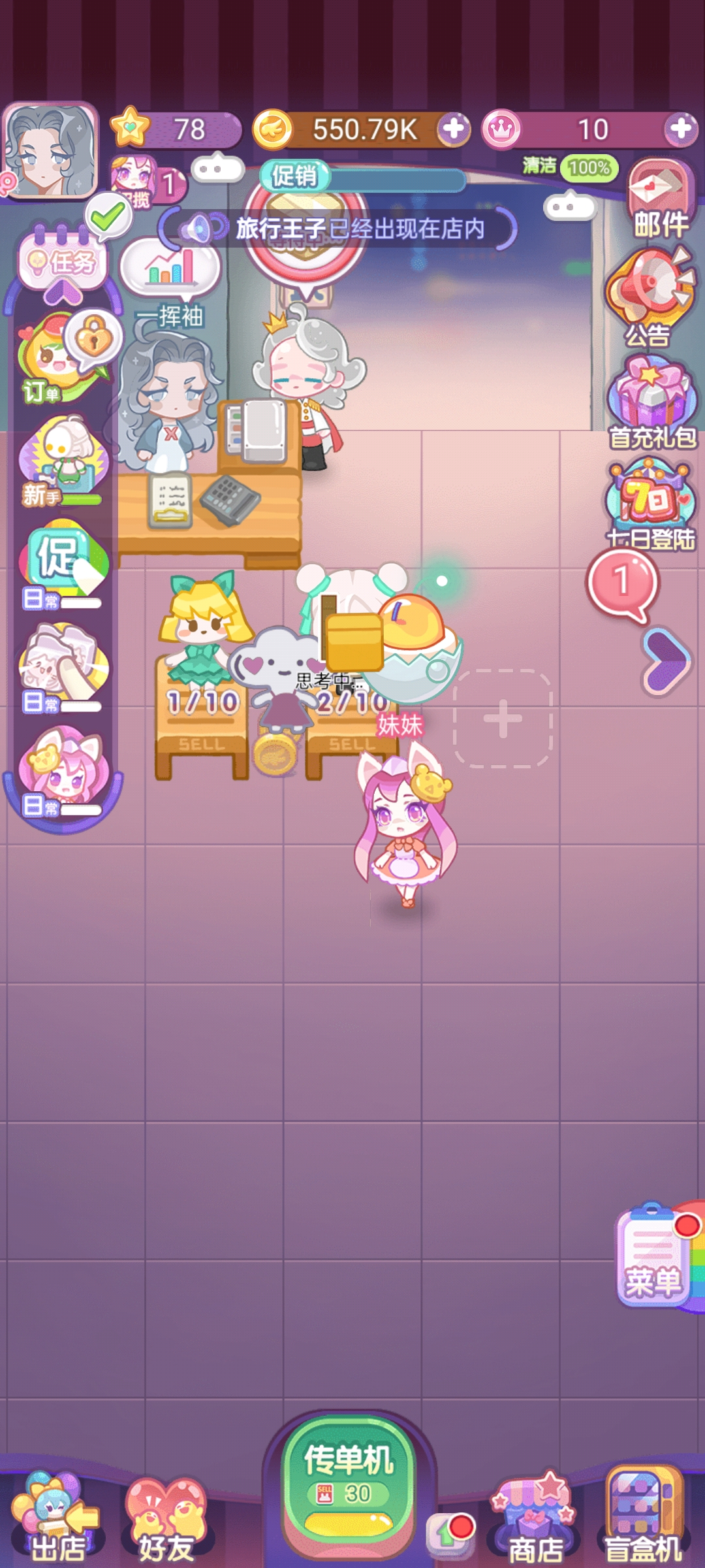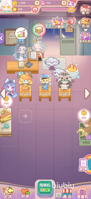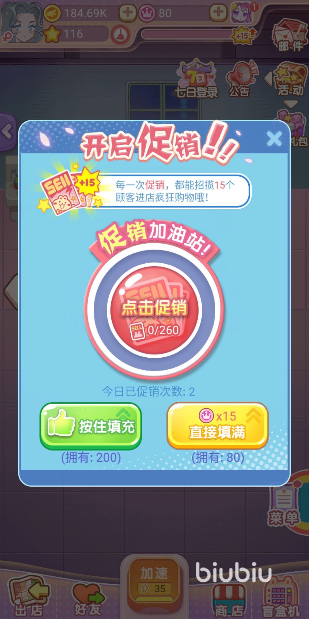 發(fā)動(dòng)促銷后,就會(huì)發(fā)現(xiàn)店內(nèi)客流量激增,玩偶以極快的速度出售掉,可以在促銷階段守著手動(dòng)補(bǔ)充貨物。