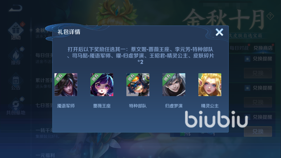 3、50個巧克力可以兌換永久皮膚寶箱,里面有魔語軍師、薔薇王座、特種部隊、日虛夢演、精靈公主供大家選擇。