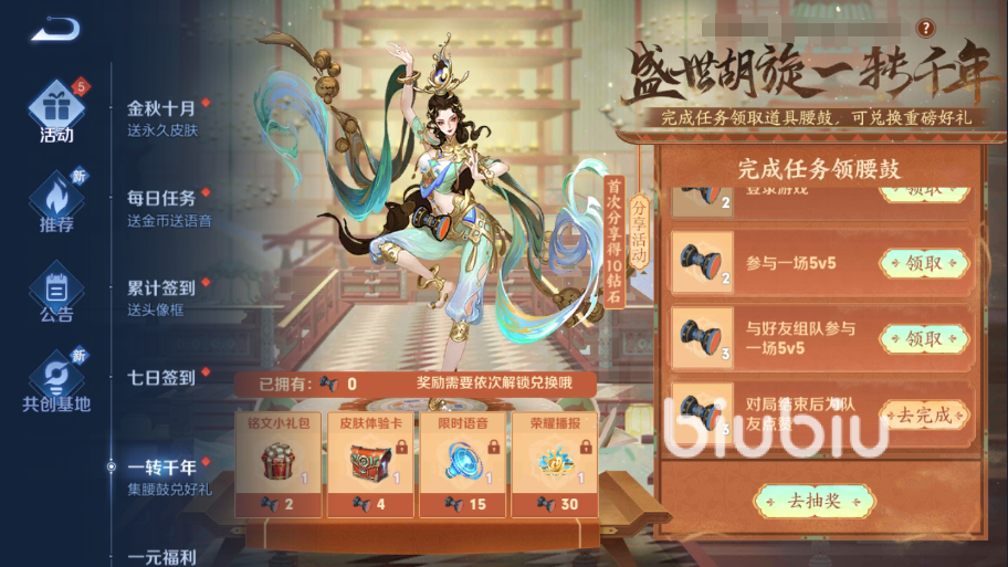 1、玩家可通過完成登錄、參與對局、與好友組隊進行對局、為隊友點贊等任務收集“腰鼓”,并依次解鎖兌換銘文小禮包、皮膚體驗卡自選寶箱、限時語音、榮耀播報等好禮。