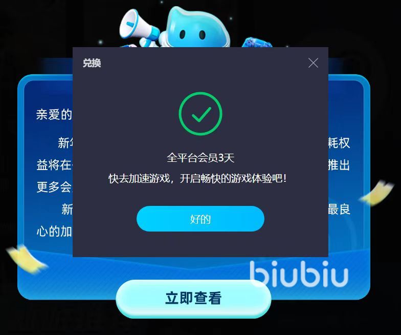 此外現(xiàn)如今打算去使用的朋友,只要在首頁中找到兌換窗,然后輸入【biubiu不卡頓】就能額外領取到3天免費加速時間,這點對于新用戶而言是十分不錯的,因為本身新用戶就能24小時的免費加速使用,在加上這個3天的時間,等于到時候能夠得到96小時的免費加速機會,讓大家能清楚的知道它的加速效果究竟如何。
