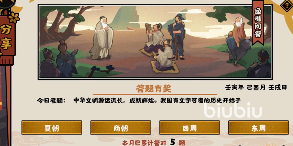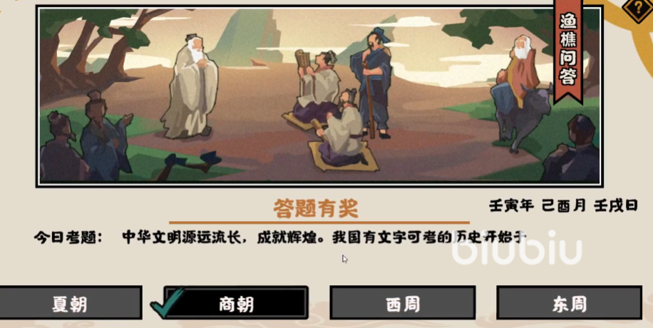 這期的漁樵問答的題目是:中華文明源遠流長,成就輝煌。我國有文字可考的歷史開始于?
