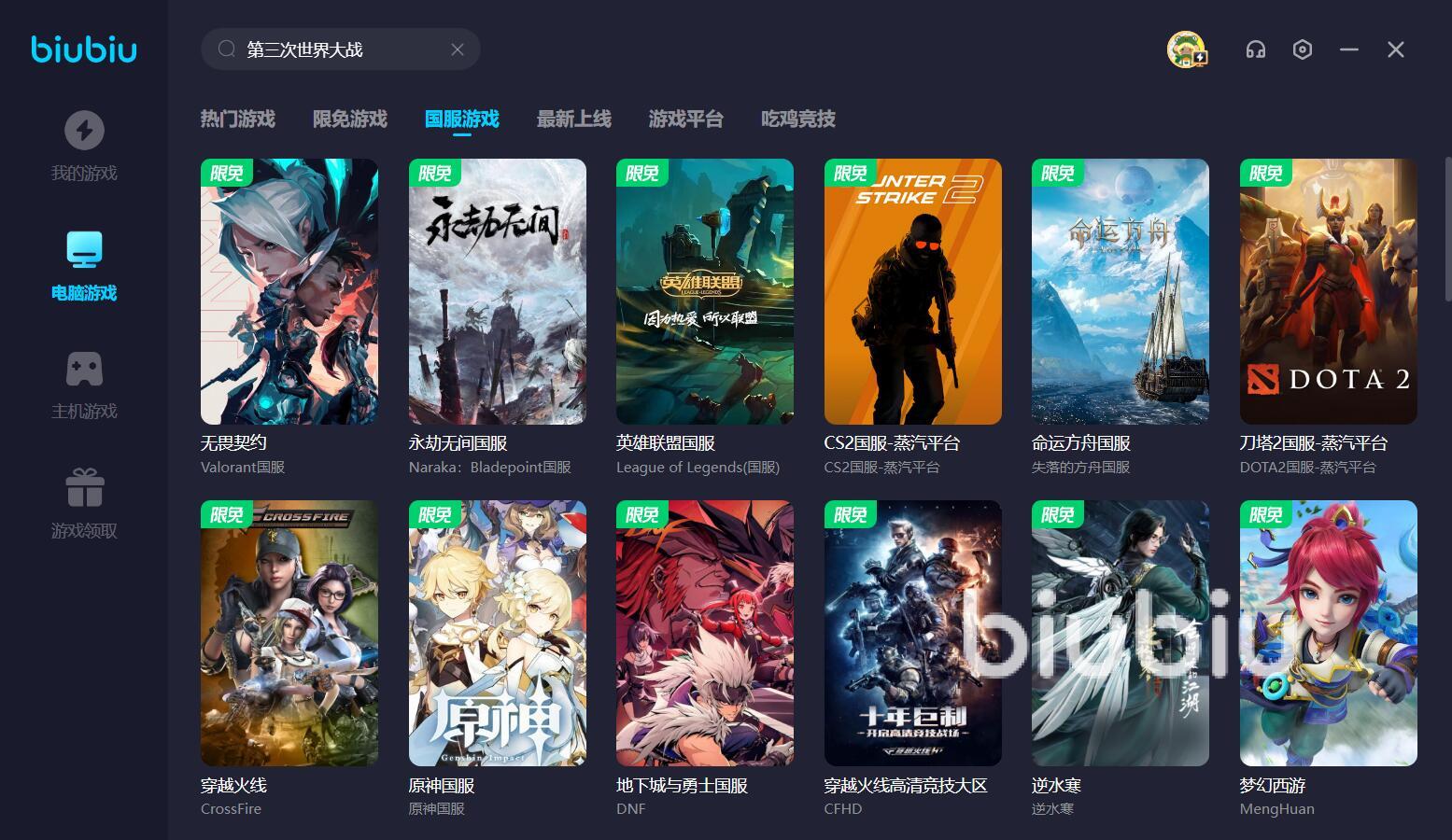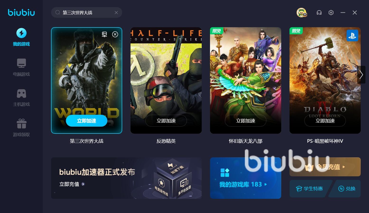 如果你比較喜歡玩國服網(wǎng)游的話,那么就算不開會員,也能享受到平臺提供的限時免費加速服務(wù),期間就能暢快地去體驗各類網(wǎng)游大作了。如果你是第一次使用的新用戶,那么完成注冊就能領(lǐng)到24小時的加速時長,此外,所有用戶在輸入兌換碼【biubiu不卡頓】之后,就能領(lǐng)到3天的加速時長。