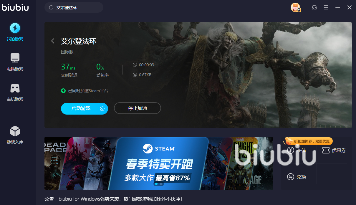 艾爾登法環(huán)作為2023年制作規(guī)模最大,宣傳最為賣力的3a大作,他并沒有辜負玩家們的期待,讓玩家們對游戲的開發(fā)者宮崎英高佩服不已!有冰與火之歌的作著操刀設(shè)計的游戲背景和主線劇情,讓玩家們體驗到了史詩一般的神話故事,精美的人物建模和boss設(shè)計,讓玩家們每次捏臉都投入滿滿,優(yōu)秀的環(huán)境破壞系統(tǒng)和物理引擎則讓玩家們體驗到了極致的打擊感,無論怎么看,這都是2023年前無古人的魂系游戲佳作!這么一款有趣的游戲怎么不可能和小伙伴們一起分享呢?看著小伙伴們痛苦的倒在魂系的各個boss前也是魂系游戲的一大游戲特色呀!可是,因為這款游戲爆火的緣故,整個服務(wù)器都在滿負荷的運轉(zhuǎn),這使得小伙伴們與朋友的艾爾登之旅十分艱難。在各位大神的推薦下,我使用了biubiu加速器對艾爾登法環(huán)進行了加速,加速之后,那流暢的感覺簡直不要太爽!在這里小編也將biubiu加速器推薦給各位老頭環(huán)的粉絲們,這是小編的加速截圖,不知道各位褪色者們羨慕不羨慕呢?