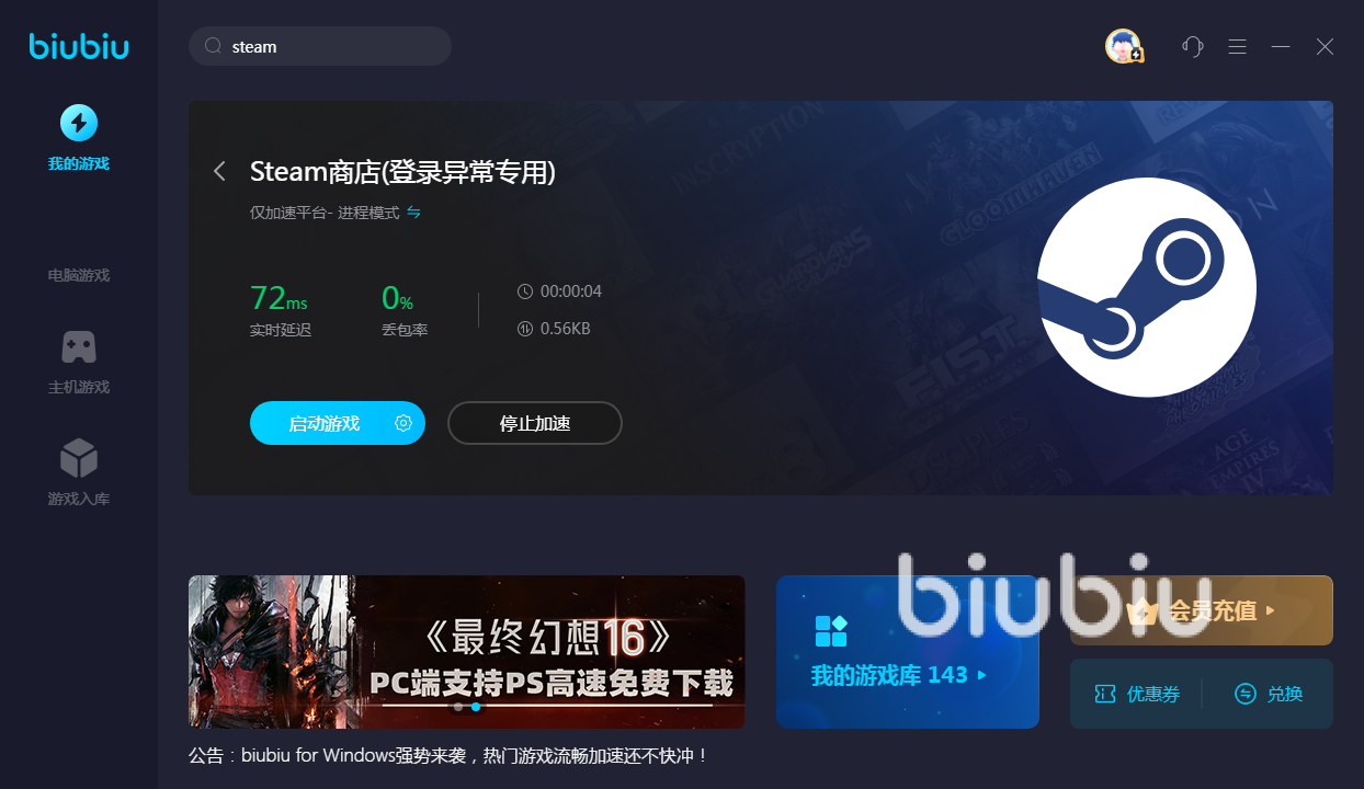 如果想登錄平臺時候變得更加流暢,無論是購買或是下載都可以利用biubiu來進(jìn)行加速,大家在輸入steam名稱之后就可以看到有很多相關(guān)內(nèi)容。其中主要就包括商店,商店與社區(qū),遠(yuǎn)程同樂,跨區(qū)入庫等內(nèi)容。如果在登錄相關(guān)游戲時出現(xiàn)失敗問題就,可以先進(jìn)入到登錄異常專用商店頁面,點擊加速后再去嘗試,相信就能得到改善。其他各種途徑的使用方式也是如此,只要加入到列表中,下次再使用的時候就會更方便。