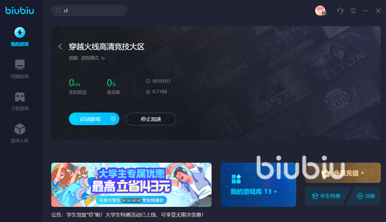 來源: 極光 作者: 澈 2023年07月25日 14:56cf想必大家都很熟悉,它伴隨了很多小伙伴們的童年。那cfhd其實就是穿越火線高清競技大區(qū)。很多小伙伴反應(yīng)cfhd卡頓掉幀怎么解決,對于一款fps游戲網(wǎng)絡(luò)的卡頓掉幀是很嚴重的問題,之前高清大區(qū)推出的時候絕大多數(shù)遇到的卡頓都是筆記本的8g運行內(nèi)存不夠,但現(xiàn)在的設(shè)備基本都是16g了,接下來小編為大家?guī)韈fhd比較好用的加速器推薦,它就是biubiu加速器。