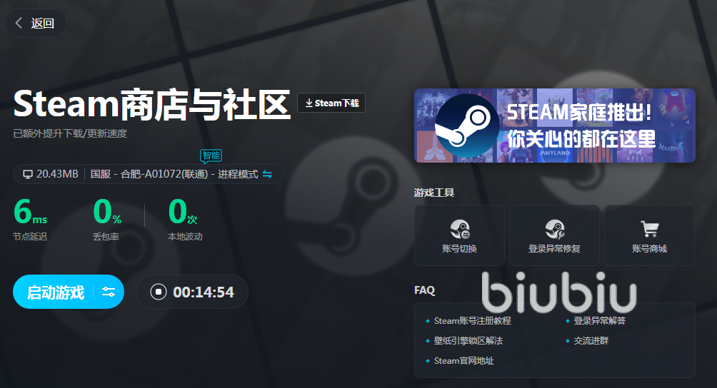 當(dāng)然對于想要體驗的玩家來說,需要切換steam到其他的區(qū)服,才可以進行體驗,所以為了保持長時間游戲在線的穩(wěn)定,biubiu也是支持steam一鍵加速的。并且在開啟了加速之后,下載游戲的過程中單獨的線路傳輸,也可以穩(wěn)定提高500%的游戲下載速度,這樣就不會遇到斷流的問題了。
