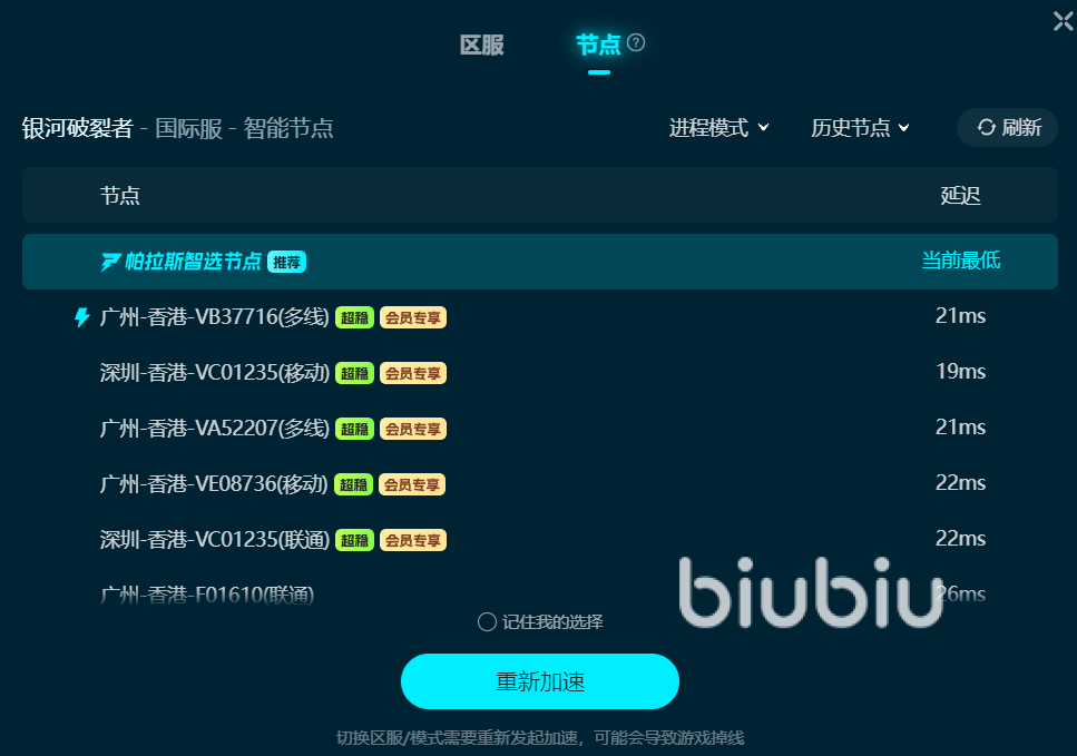 根據大量信息返回,大家開了Biubiu后,不僅有根源地追蹤優(yōu)化所選的寬帶核心等,還在局內操作時感受顯著提升。小編也是親自測試過的,良好手感真的是立竿見影。而且,如果當前節(jié)點效果不理想,它允許隨時手動更換節(jié)點,靈活優(yōu)化隨時切換。