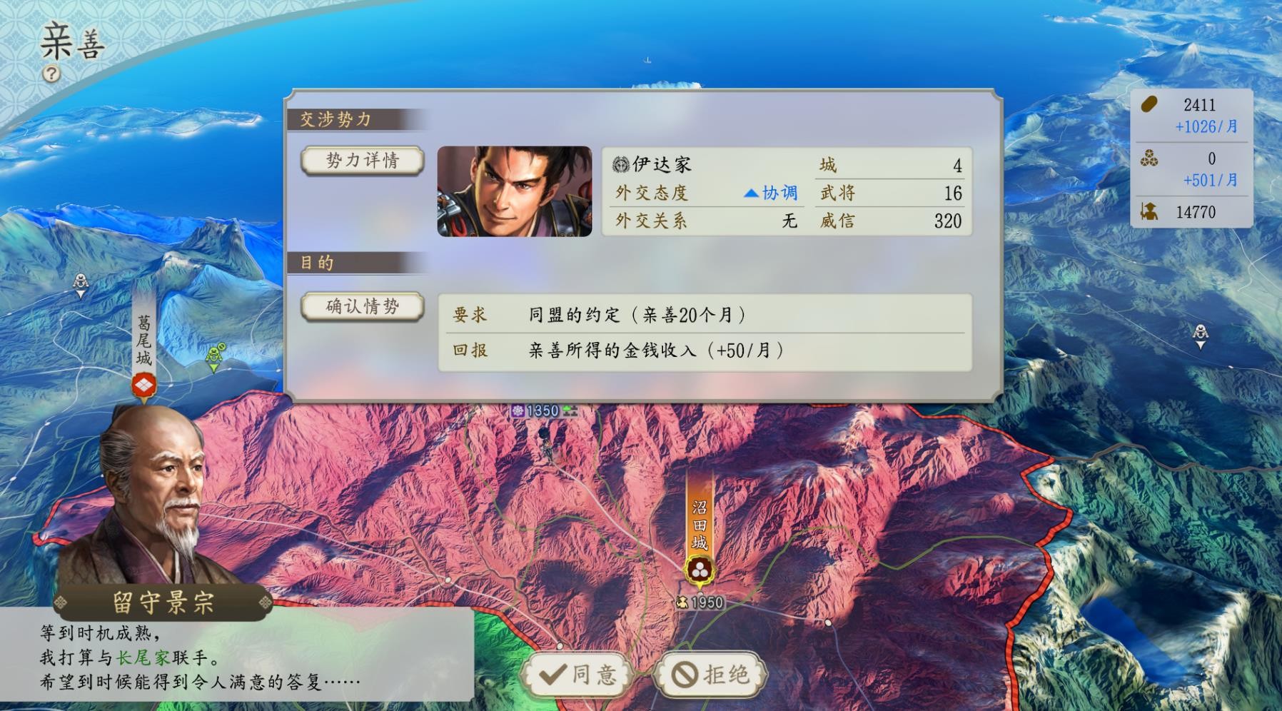 上來(lái)之后直接解除軍團(tuán),因?yàn)樾掳l(fā)田還是需要玩家自己來(lái)守,先做完兩個(gè)新手任務(wù),因?yàn)樾枰奶幷鲬?zhàn)的緣故,所以比較缺糧,直接選擇米行加入會(huì)。游戲內(nèi)第24小時(shí)的時(shí)間就要發(fā)出沼田,先出發(fā)去占郡城,時(shí)間非常緊迫。伊達(dá)家會(huì)來(lái)表示親善,需要多關(guān)注動(dòng)向,保持不弱不強(qiáng)的狀態(tài)。