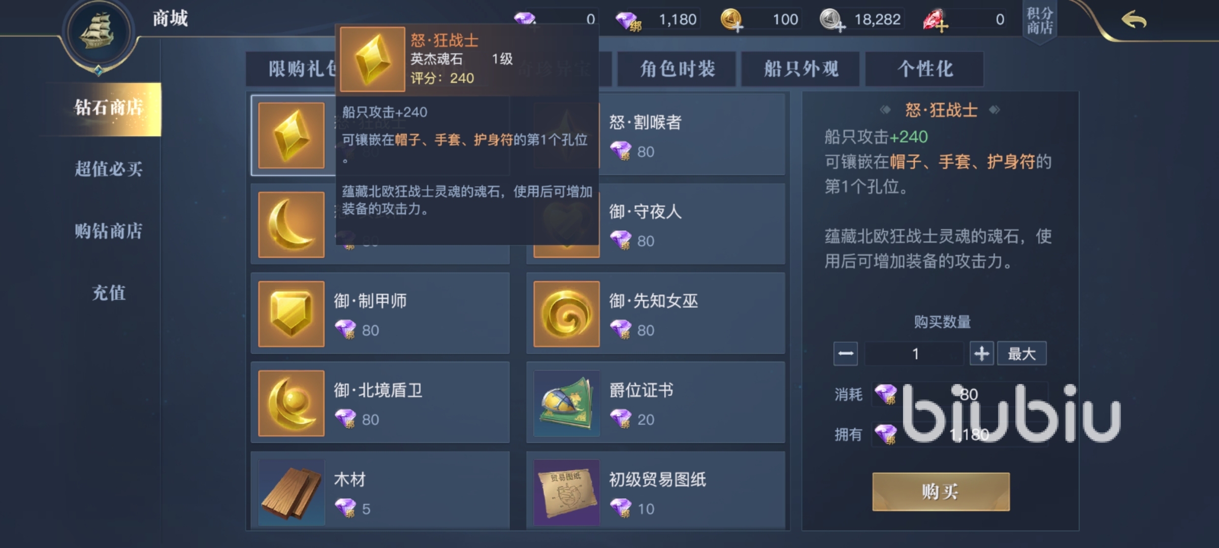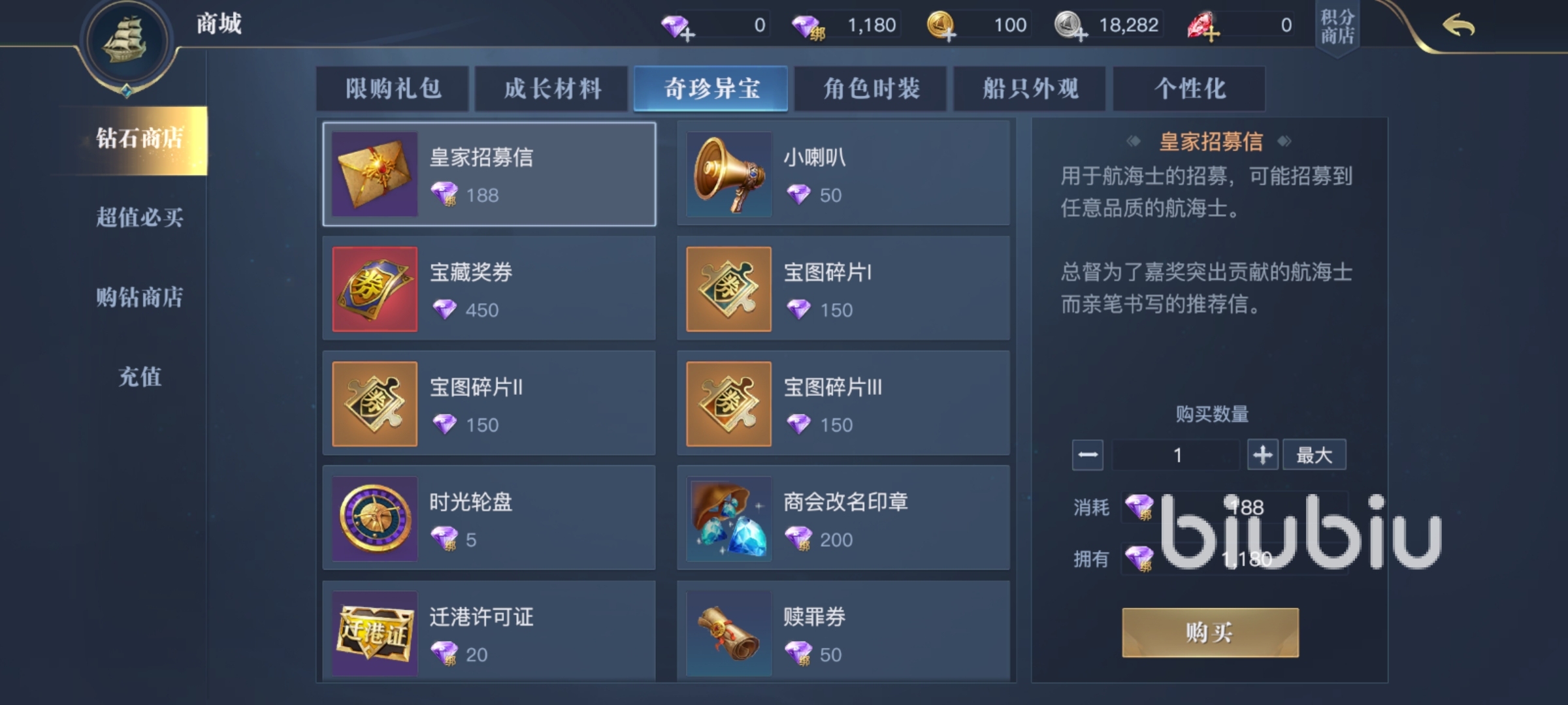 想要進(jìn)行上述方面的戰(zhàn)力增長(zhǎng)操作,除了將需要做的活動(dòng)和副本全部清理完之后,商城中適當(dāng)?shù)馁徺I一些道具也是必不可少的。例如在鉆石商城中購買,魂石自選箱可以開出高品質(zhì)魂石。在成長(zhǎng)材料商店中能夠直接購買到橙色品質(zhì)的英靈印刻。以及紅色品質(zhì)和橙色品質(zhì)的戰(zhàn)斗圖紙,用于改造船裝。在奇珍異寶商店中可以購買到皇家招募信,想要抽到高品質(zhì)的航海士,必須經(jīng)過多次招募。