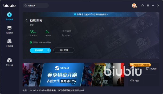 目前biubiu 加速器為了回饋新玩家的加入,現(xiàn)在只要您注冊biubiu 加速器的賬號就會自動送您24小時的會員。這個贈送的會員沒有任何的使用要求,不存在只能加速特定游戲的情況。只要是您想玩的游戲,它都可以進行加速。除此之外還有著大量的折扣券會贈送給新玩家,最低可以拿到10元每月的加速優(yōu)惠價。10元就可以享受一整個月的穩(wěn)定戰(zhàn)艦世界游玩,聽小編如此介紹,您是不是心動了呢?那請您不要猶豫,快去下載biubiu 加速器暢玩游戲吧!