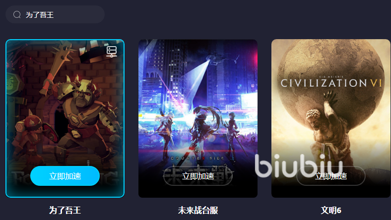 biubiu加速器的整個(gè)加速界面很是簡(jiǎn)潔,玩家們可以直接在首頁(yè)搜索為了吾王,找到對(duì)應(yīng)的游戲之后點(diǎn)擊立即添加/立即加速,加速完成之后我們?cè)俅芜M(jìn)入游戲就能明顯的感覺(jué)到網(wǎng)速變快了,隨開(kāi)隨用,非常的便捷。