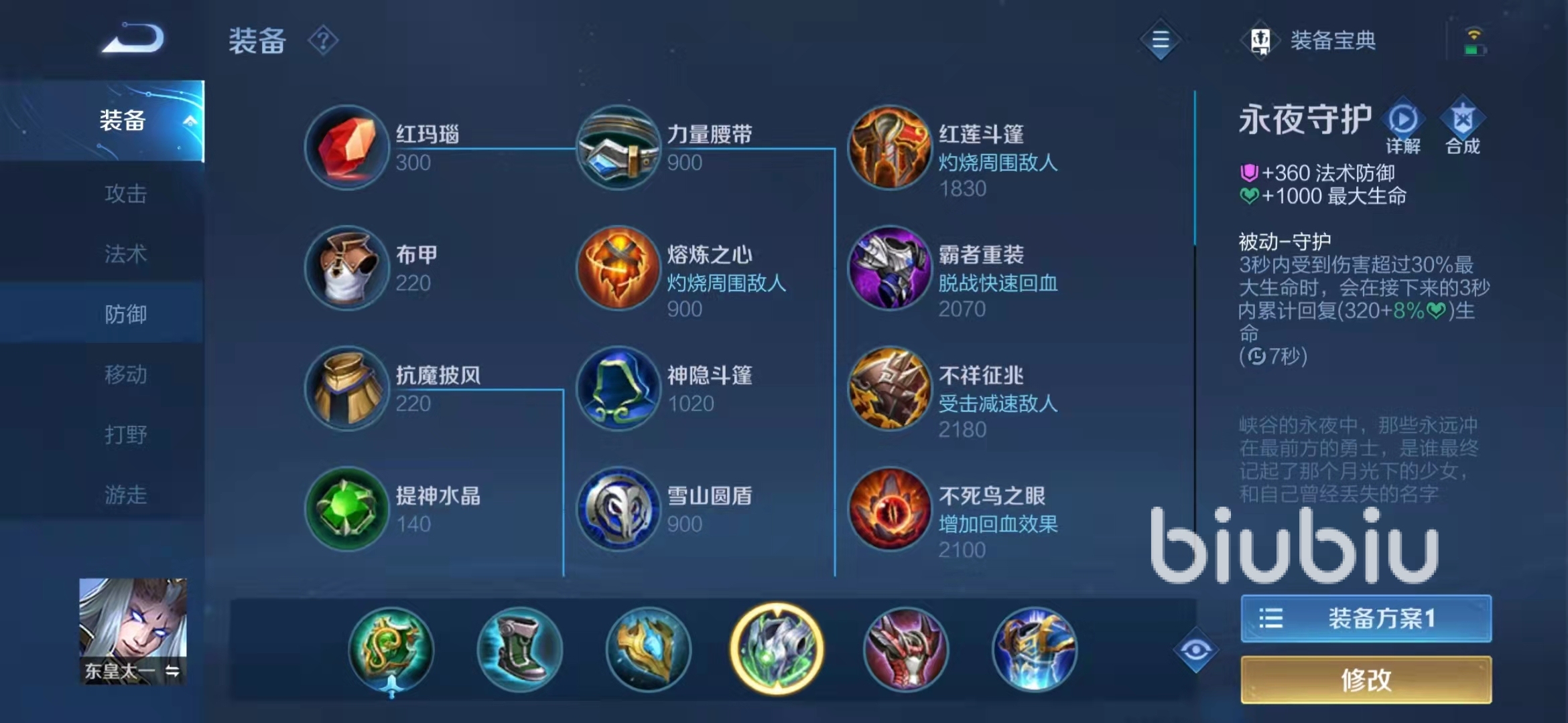 東皇作為一個(gè)輔助,第一件裝備自然是要出輔助裝。建議出加盾的輔助裝,然后第二件出韌性鞋。接著再出一個(gè)極寒風(fēng)暴,減少技能CD,還可以增加防御值。然后出一個(gè)永夜守護(hù),能夠增加魔抗,還可以回血。之后再出一個(gè)反傷刺甲,反彈敵人的物理傷害。最后再補(bǔ)一個(gè)復(fù)活甲,增加容錯(cuò)率。