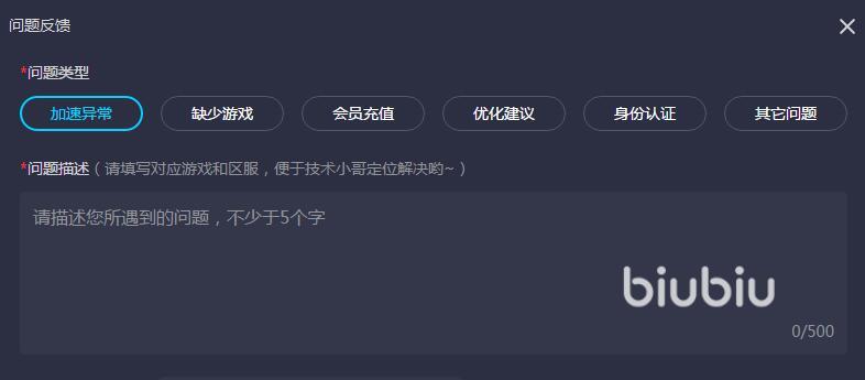 PC端上的問題反饋功能,可以幫助玩家們改善各種游戲當(dāng)中的新問題。目前,各位玩家可以通過該功能實現(xiàn)各種優(yōu)化建議內(nèi)容的提交,或者幫助平臺反饋部分加速時遇到的問題。當(dāng)玩家們反饋的信息越多,那么biubiu加速器會在后續(xù)服務(wù)當(dāng)中進行改善,從而讓玩家們獲得更好的游戲體驗。
