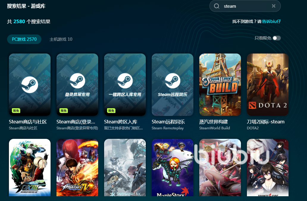biubiu游戲庫特別強(qiáng)大,里面的資源覆蓋全球游戲,不僅有3A大作,還有很多好玩的小眾游戲。大部分游戲不止收錄了一個(gè)服務(wù)器,大家在加速的時(shí)候可以選擇自己玩的服務(wù)器來啟動(dòng),韓服、國(guó)服、美服盡在其中。用戶通過直接搜索游戲名來找到游戲資源,也能在游戲分類里面慢慢挑選想玩的游戲,還能申請(qǐng)?zhí)砑诱緝?nèi)暫時(shí)找不到的游戲。