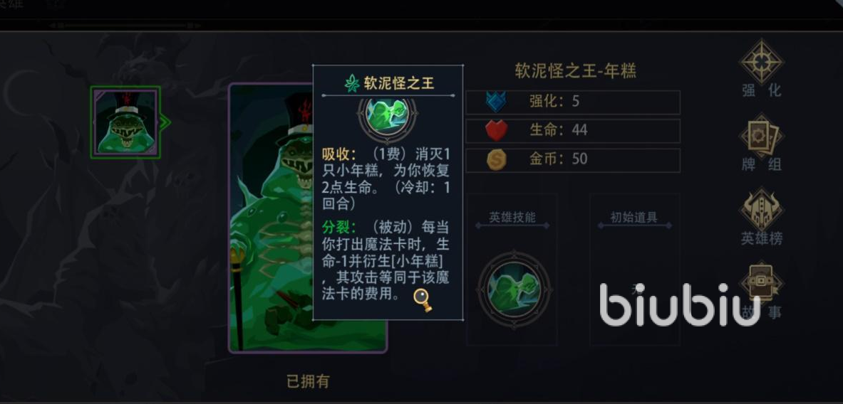 軟泥怪之王年糕擁有在使用任何魔法卡時都會在隨機的友方空格中制造小年糕的能力,小年糕初始5血,輪回3強化后9血,在上一次更新中得到了類似小狐貍的成長效果,使得其單體作戰(zhàn)能力大大提升,主動技能則可以主動破壞掉場上的小年糕回復(fù)生命值,這兩點血量微不足道,但是重點則在這個主動破壞的效果上。