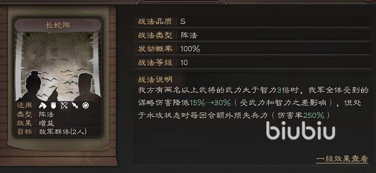 而長(zhǎng)蛇陣,它作為一個(gè)S級(jí)的增益陣法技,同時(shí)也是一個(gè)群體技,只要陣容里有兩個(gè)武將的武力值高于智力值的三倍,一旦己方陣容被敵人謀略攻擊的話,那么其傷害就能最高降低百分之三十,不過這個(gè)陣法也是有一個(gè)不太好的地方,就是它會(huì)有額外的水攻傷害,一旦被水攻的話就會(huì)損失一定的兵力。