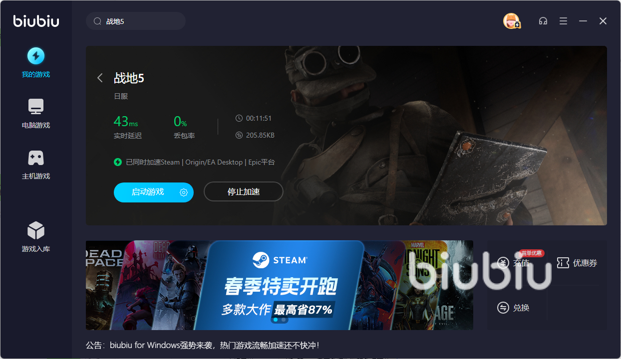 來源: 極光 作者: 羅斯 2023年03月27日 17:56戰(zhàn)地5作為現(xiàn)如今做火熱的fps類游戲,因?yàn)槠涑錾挠螒驒C(jī)制和精致的畫面,一經(jīng)發(fā)售就引起了無數(shù)fps愛好者的關(guān)注,但是因?yàn)閼?zhàn)地5并沒有國服的原因,所以經(jīng)常會(huì)發(fā)生卡頓,那么,戰(zhàn)地5用什么加速器好呢?小編在體驗(yàn)了各種各樣的加速器后,小編還是覺得biubiu加速器更為的優(yōu)秀,接下來讓小編為大家詳細(xì)介紹一下biubiu的優(yōu)點(diǎn)和使用方法吧~