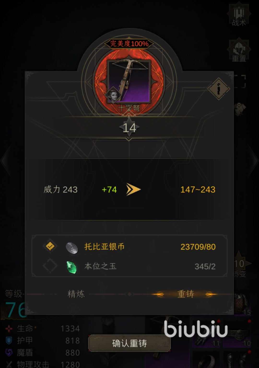 當(dāng)然,也不是所有的裝備都需要重鑄的,只有當(dāng)裝備的完美度比較低時,才需要對裝備重鑄。每次重鑄后,會重新計算裝備的完美度,完美度比較高時,就不需要繼續(xù)重鑄啦。