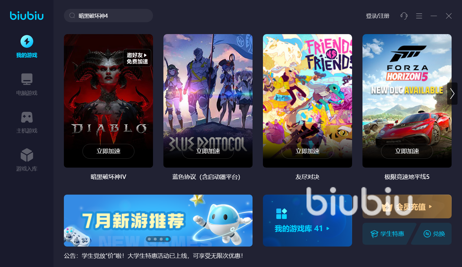 biubiu對(duì)于新老用戶都非常友好,新用戶享受前24小時(shí)免費(fèi)加速體驗(yàn),任意為各種游戲加速。然后,第一次充值享受超低折扣,用戶每次消費(fèi)月卡費(fèi)用也超低。軟件長(zhǎng)期用戶熟悉這一工具的特點(diǎn),它設(shè)置免費(fèi)專區(qū),為各類主機(jī)游戲加速,覆蓋了STEAM、PS、XBOX、SWITCH等平臺(tái),讓用戶隨意暢玩喜愛(ài)的游戲。此外,biubiu線上游戲社區(qū)分享游戲秘籍、攻略。