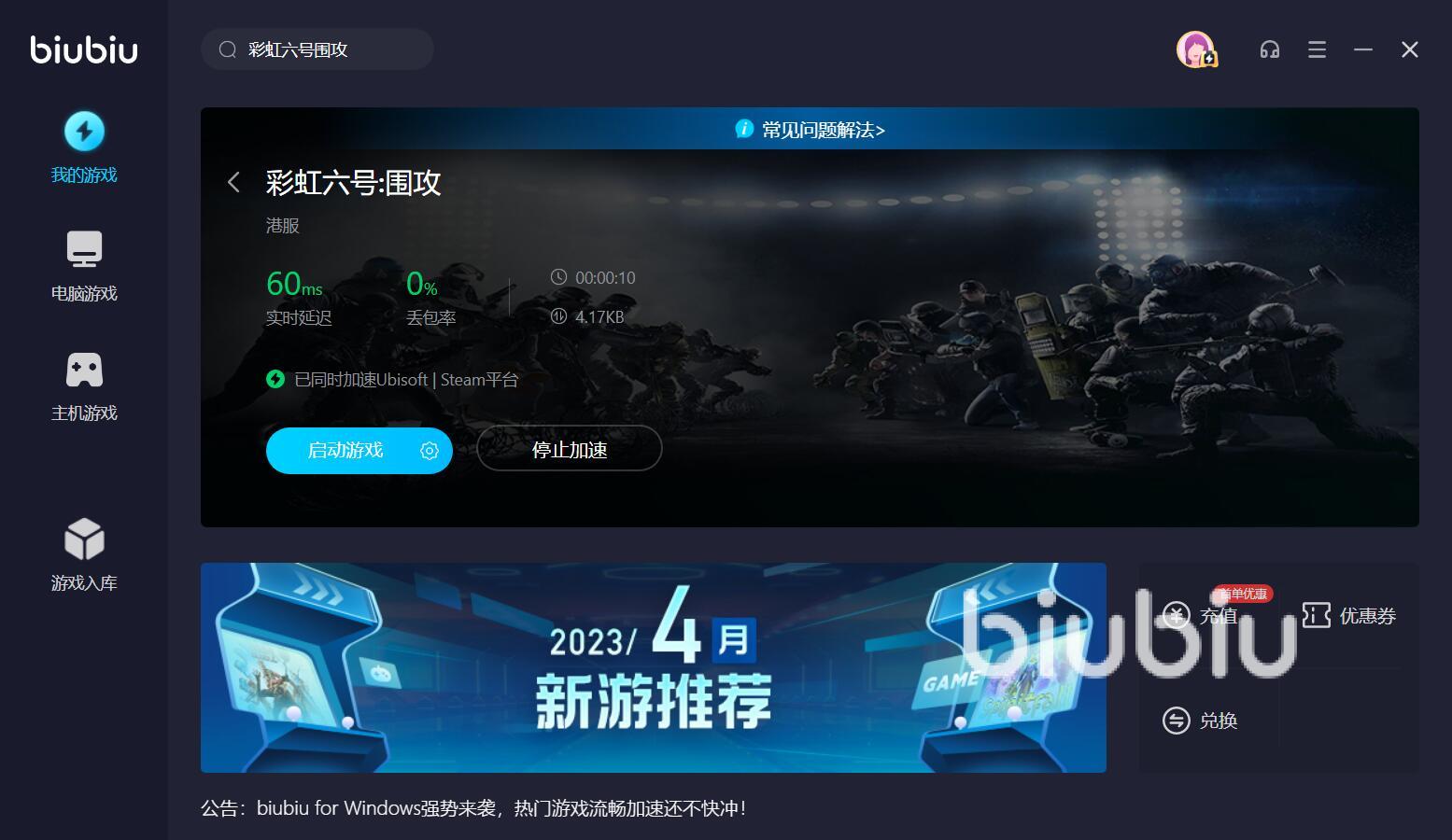 以上就是彩虹六號(hào)圍攻卡頓怎么辦,在和隊(duì)友組隊(duì)?wèi)?zhàn)斗的時(shí)候,延遲過高不僅影響自己的發(fā)揮,還會(huì)讓心情變?cè)愀猓貏e是在戰(zhàn)斗最為緊張的時(shí)候,稍有不慎,就會(huì)落得個(gè)滿盤皆輸。如果你覺得biubiu加速器還不錯(cuò),那么可以下載安裝去試一試。