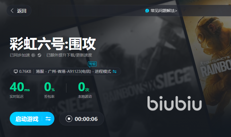 而談到聯(lián)機(jī)模式,就無可避免的談到加速器了,biubiu加速器就可以給R6加速器,不管是新人還是老玩家都可以通過“biubiu不卡頓”兌換碼來領(lǐng)取3天免費(fèi)加速時長,要注意字母小寫哦!配上新用戶的24小時加速時長,也就是96小時免費(fèi)加速時長,好不好用直接一試便知。只需在加速器游戲庫中搜索該游戲名,然后就可以啟動加速了。