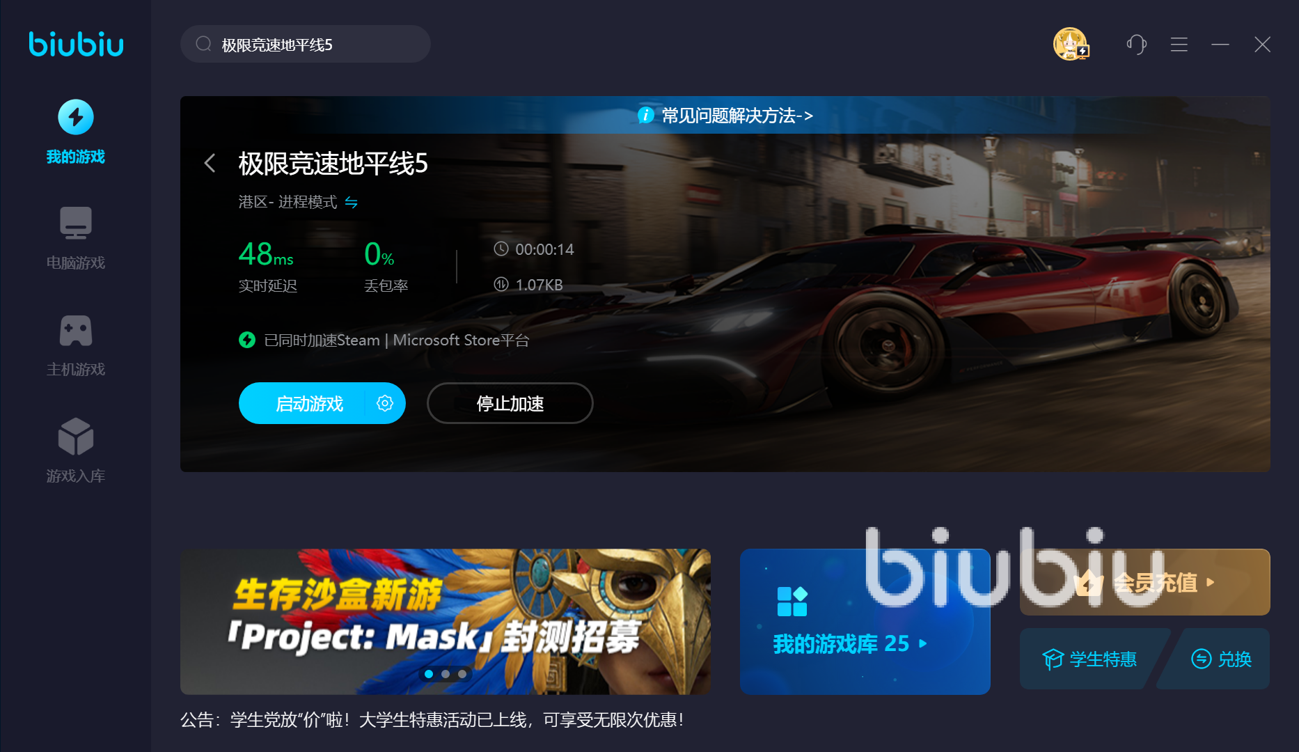 因?yàn)闃O限競(jìng)速地平線5本身的游戲服務(wù)器是建立在全球的各個(gè)城市之外,就是排除了國(guó)外在內(nèi)的服務(wù)器,所以它就是個(gè)特別標(biāo)準(zhǔn)的海外游戲,還是在微軟跟Steam直接去售賣(mài)的,你要是不走這兩個(gè)海外平臺(tái)的話連進(jìn)行游戲的資格都沒(méi)有,就算是有辦法也將面臨上百的高延遲,不過(guò)再高的延遲也能通過(guò)biubiu的加速得到降低,那么究竟表現(xiàn)如何大家可直接在首頁(yè)的展示里自行查看,要實(shí)在擔(dān)心延遲效果的話,也是能通過(guò)新用戶(hù)的首次注冊(cè)領(lǐng)取24小時(shí)體驗(yàn)來(lái)化解的。