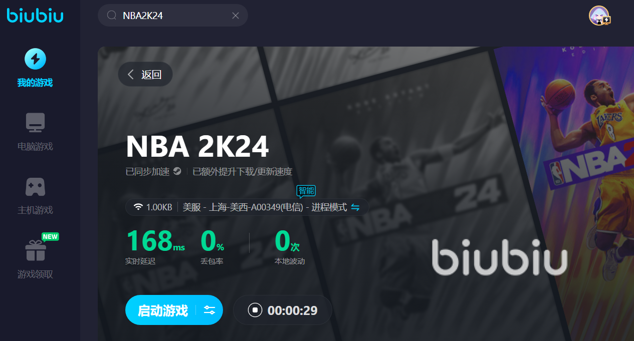NBA2K24是biubiu加速器可以加速的游戲之一,玩家在加速NBA2K24的時候,如果自己電腦上有這款游戲的話,在biubiu的:“我的游戲”板塊可以自動檢測出游戲,點擊就可以進行游戲加速,開啟網(wǎng)絡(luò)加速之后就可以享受專屬的游戲網(wǎng)絡(luò),讓玩家的游戲體驗更好。