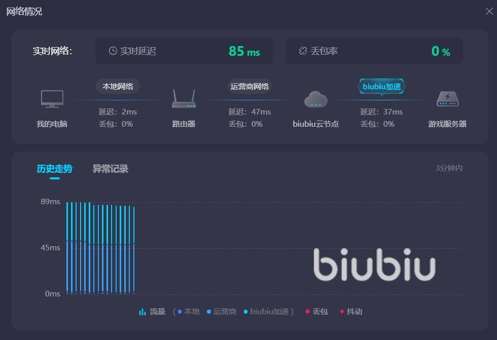加速開啟之后,系統(tǒng)會(huì)實(shí)時(shí)監(jiān)測(cè)網(wǎng)絡(luò)的狀況,在下圖所示的界面中,大家可以清楚地看到網(wǎng)絡(luò)的當(dāng)前的延遲、丟包率以及波動(dòng)次數(shù),如果出現(xiàn)異常的話,大家可以及時(shí)更換其他節(jié)點(diǎn)。