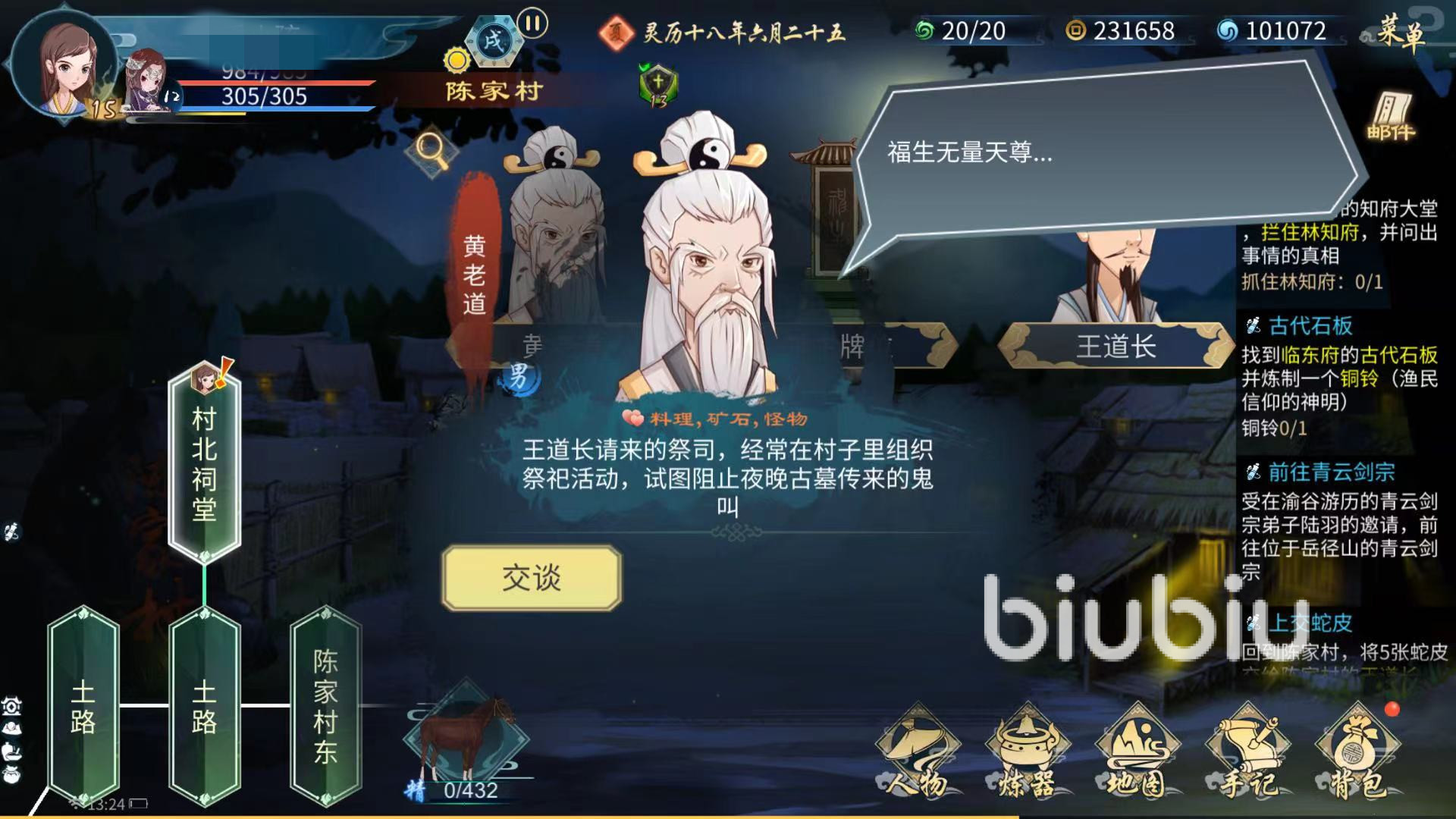 在此地點(diǎn)還包括王道長,他是陳家村祠堂的道士,早年間入贅陳家村,現(xiàn)在負(fù)責(zé)村中的祭祀活動(dòng),通過修葺祖墳,制作法器最好的材料就是蛇皮,需要女俠在后山小路中打些蛇皮供制作法器使用。