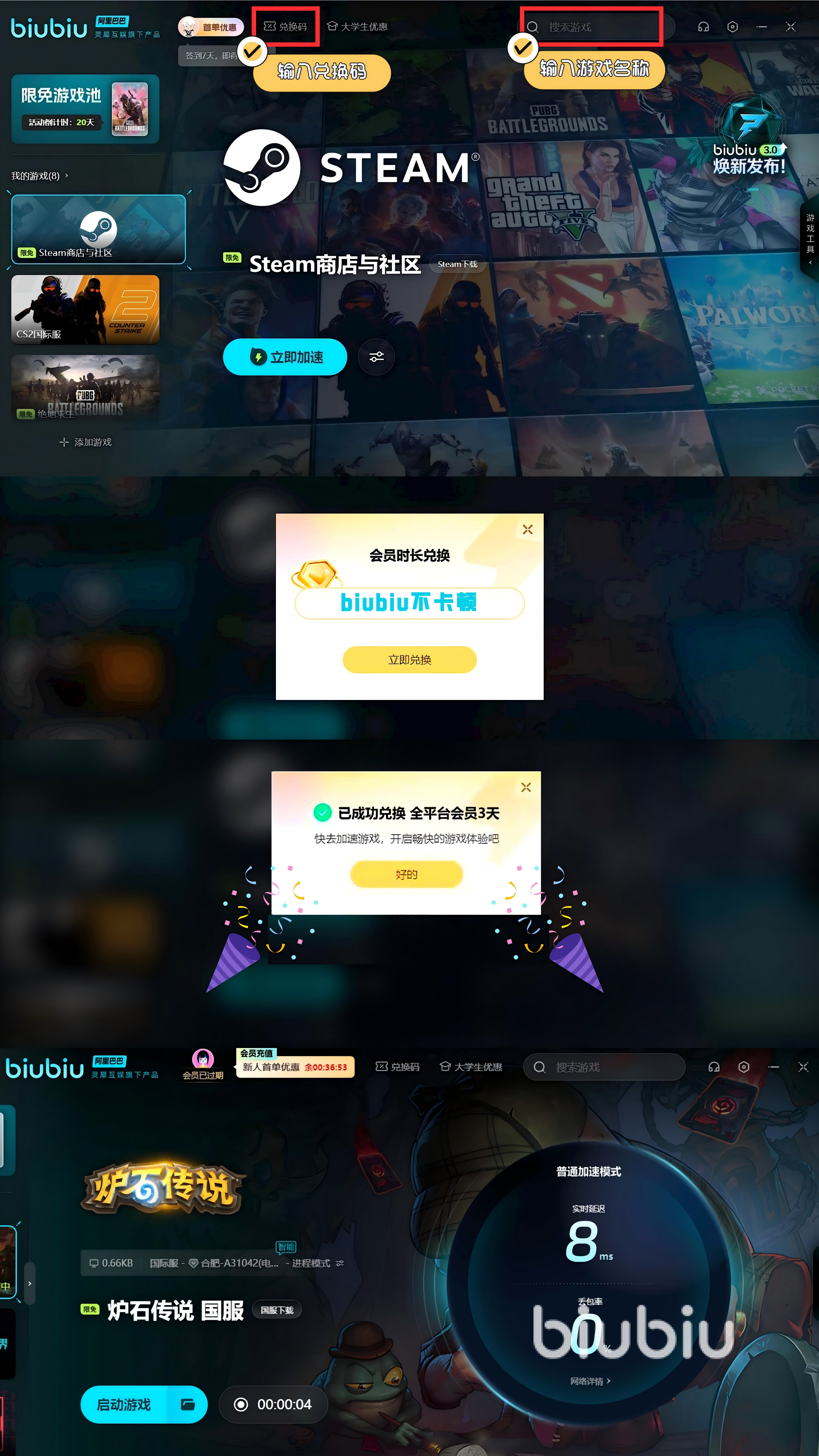 現(xiàn)在用biubiu加速器還有福利的呢,新人登錄之后領(lǐng)取到的免費加速時間是有24小時的,另外兌換碼活動也是在開放的,新老用戶都可以用【biubiu不卡頓】換得額外的72小時加速時長,等于加一起新用戶可以用到96小時的。